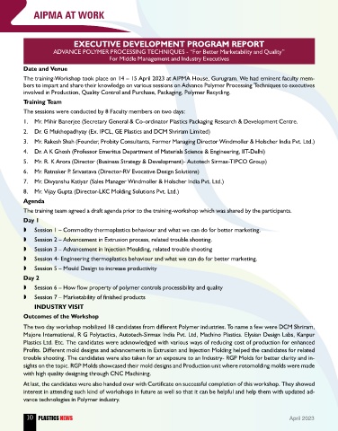 bers to impart and share their knowledge on various sessions on Advance Polymer Processing Techniques to executives