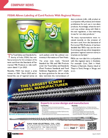 Tthority of India (FSSAI) has noti- troversy in Karnataka and Tamil Nadu. FBOs can now label the curd packets