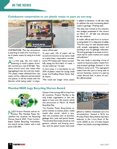 GO Project Mumbai and its ini- spires citizens to donate plastic waste gifted to children volunteers and civic