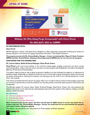 AIPMA organized a webinar with Chem-Trend, Bangalore on Why using purge compounds? Facilitating the industry to