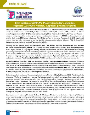 dedicate the success of Plastivision India 2023 to AIPMA’s members and 4 million+ collaborator community.”