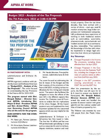 OUR EXPERTS FOR THE EVEN- attendees. 100 people from the Plastic Indus-