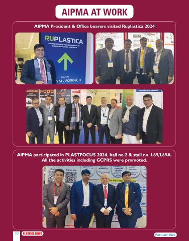 AIPMA AT WORK AIPMA President & Office bearers visited Ruplastica 2024 AIPMA participated in PLASTFOCUS 2024, hall no.2 & stall no. L69/L69A. All the activities including GCPRS were promoted. 10 PLASTICS NEWS February 2024