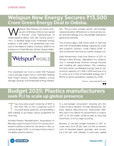 coming Budget 2025, to increase India's share in cost of recycled plastic granules, and provid-