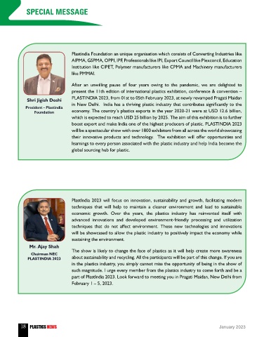 Shri Jigish Doshi PLASTINDIA 2023, from 01st to 05th February 2023, at newly revamped Pragati Maidan