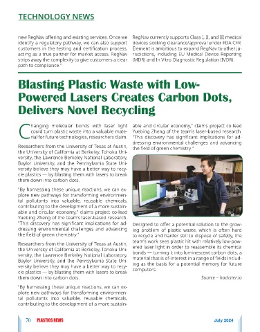 could turn plastic waste into a valuable mate- Yuebing Zheng of the team's laser-based research.