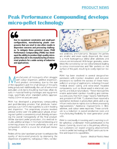 Performance Compounding (PEAK) has devel- tive additives, and lubricants. Because the pellets