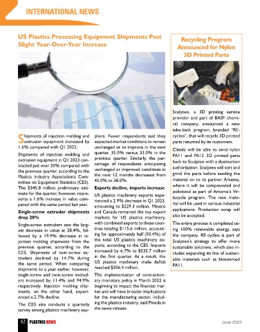 Single-screw extruder shipments and Canada remained the top export applications. Production scrap will