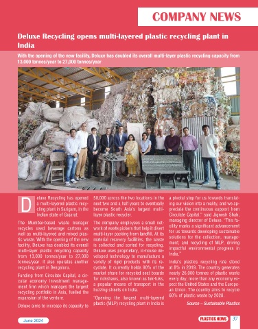 Deluxe aims to increase its capacity to plastic (MLP) recycling plant in India is Source – Sustainable Plastics