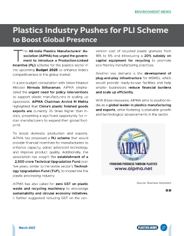Incentive (PLI) scheme for the plastics sector in eco-friendly manufacturing practices.