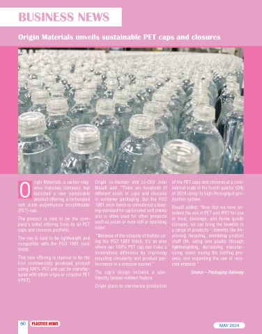 rigin Materials, a carbon-neg- Origin co-founder and co-CEO John of the PET caps and closures at a com-