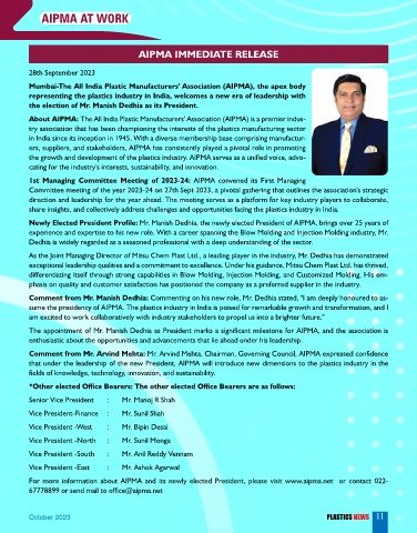 sume the presidency of AIPMA. The plastics industry in India is poised for remarkable growth and transformation, and I