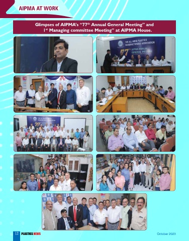 AIPMA AT WORK Glimpses of AIPMA’s “77 Annual General Meeting” and th 1 Managing committee Meeting” at AIPMA House. st 12 PLASTICS NEWSASTICS NEWSASTICS NEWS October 2023 12 PL PLASTICS NEWS 12 12 PL October 2023