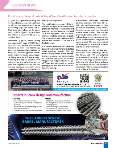RecyClass, the first approved certifi- ment is incorporated at low concen- DataLase’s chief technology officer,